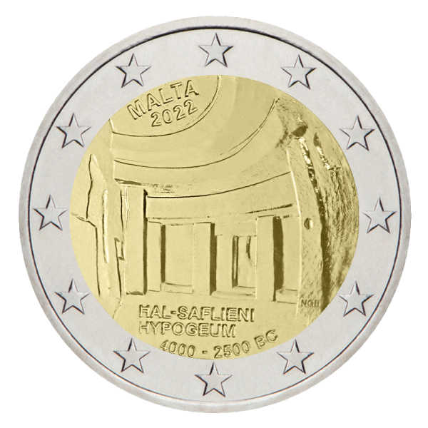 Šios monetos averse detaliai pavaizduotas Ņal Saflieni hipogeumas, esantis Paoloje, Maltoje. Graviūrose pavaizduotas šio požeminio statinio vidus, išryškinant jo kameras ir raižytus praėjimus. Viršuje užrašas „MALTA 2022“ nurodo išleidusią šalį ir išleidimo metus. Apačioje užrašas „HAL-SAFILIENI HYPOGEUM 4000-2500 BC“ nurodo hipogeumo statybos laikotarpį.