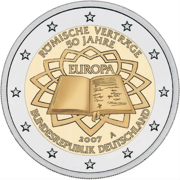 Romos Piazza del Campidoglio aikštės, kur 1957 m. kovo 25 d. buvo pasirašyta Sutartis, grindinį (sukurtą Michelangelo) primenančiame fone pavaizduotas Sutarties dokumentas, kurį pasirašė šešios Bendriją įsteigusios šalys. Užrašai „Romos sutartis, 50 metų“ ir „EUROPA“ bei monetą leidžiančios šalies pavadinimas yra atitinkamomis euro zonos kalbomis arba lotynų kalba. Taigi, kiekvienoje šalyje užrašas yra skirtingas, tačiau atvaizdas yra toks pat. Romos sutartimi buvo įkurta Europos ekonominė bendrija, ir 1999 m. buvo įvestas euro, o 2002 m. pasirodė eurų banknotai ir monetos. Metinės buvo švenčiamos 2007 m. kovo 25 d. Euro zonos šalys nusprendė paminėti progą kartu išleisdamos šią proginę monetą. Jos dizainas buvo išrinktas Europos kalykloms organizavus konkursą. Monetos išorinėje dalyje (žiede) išdėstytos dvylika Europos Sąjungos žvaigždžių.