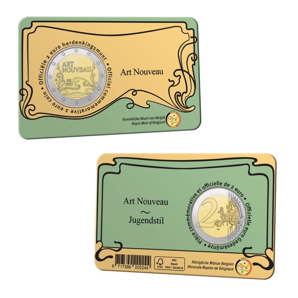 Monetos averse pavaizduota dekoratyvi detalė iš „Hotel Van Eetvelde“ fasado – legendinio namo Briuselyje, pripažinto UNESCO pasaulio paveldu, kurį suprojektavo belgų art nouveau architektas Viktoras Horta. Lenktos, asimetriškos, tarsi gėlės šios dekoratyvinės linijos atspindi gamtos įkvėptą art nouveau judėjimo stilių. Ši detalė užpildo apatinę kūrinio pusę, paliekant laisvą vietą viršutinėje pusėje, kurioje iškaldinti žodžiai „ART NOUVEAU“. Dešinėje pusėje dizainerės Iris Bruijns inicialai.