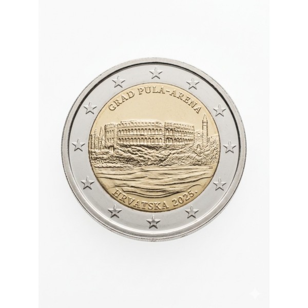 Taip pat monetoje yra įrašas „Pulska Arena“ (Pulos arena). Šis kroatų kalba pateiktas užrašas aiškiai identifikuoja pavaizduotą monumentą. Be to, įrašytas leidžiančiosios šalies pavadinimas „HRVATSKA“ (Kroatija), patvirtinantis su šiuo paveldu siejamą nacionalinį pasididžiavimą. Taip pat išgraviruoti išleidimo metai „2025“, pabrėžiantys ryšį su proginiu įvykiu.