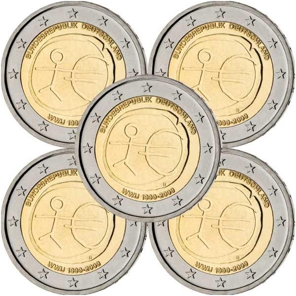 Aprašymas: Monetoje pavaizduota figūra iš pagaliukų, susijungianti su simboliu „€“. Taip perteikiama bendrosios valiutos, o plačiąja prasme – ekonominės ir pinigų sąjungos (EPS), kaip paskutinio žingsnio ilgame Europos prekybos ir ekonomikos integracijos procese, idėja. Moneta leidžiama kiekvienoje euro zonos šalyje, joje iškaltas šalies pavadinimas (čia nepavaizduota) bei užrašas „EMU 1999-2009“ (EPS 1999–2009 m.) atitinkamos šalies kalba (kalbomis). Šį dizainą iš penkių atrinktų variantų išrinko Europos Sąjungos piliečiai balsuodami internetu. Jį sukūrė George Stamatopoulos, Bank of Greece kalyklos skyriaus skulptorius. Monetos išorinėje dalyje (žiede) išdėstytos 12 Europos Sąjungos žvaigždžių.