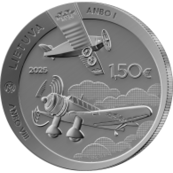 Monetos averse – stilizuoti ANBO modeliai, dvigubas kryžius, puslankiu – lėktuvų pavadinimai „ANBO I“ ir „ANBO VIII“, užrašas „Lietuva“, monetų gamintojos UAB „Lietuvos monetų kalyklos“ logotipas, greta modelių – monetos nominalas „1,50 €“ ir 2025 metai.