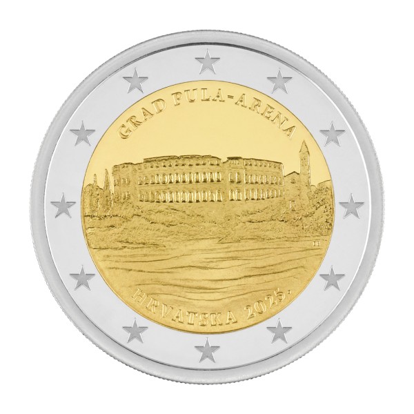 Taip pat monetoje yra įrašas „Pulska Arena“ (Pulos arena). Šis kroatų kalba pateiktas užrašas aiškiai identifikuoja pavaizduotą monumentą. Be to, įrašytas leidžiančiosios šalies pavadinimas „HRVATSKA“ (Kroatija), patvirtinantis su šiuo paveldu siejamą nacionalinį pasididžiavimą. Taip pat išgraviruoti išleidimo metai „2025“, pabrėžiantys ryšį su proginiu įvykiu.