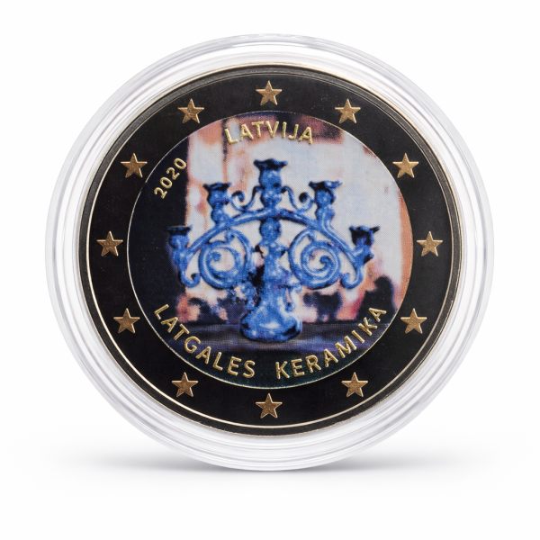 Ši moneta skirta latgalių keramikai. Tradicinė keramika ilgą laiką formavosi dviejose – Latgalos ir Kuršo – srityse, bet tik Latgalos srityje ji išliko ir buvo perduodama iš kartos į kartą. Latgalių keramika taip pat įtraukta į Latvijos kultūros paveldo sąrašą. Monetoje pavaizduotas būdingas latgalių keramikos dirbinys – molinis kandeliabras. Monetoje iškaltas įrašas „LATGALES KERAMIKA“ (latgalių keramika), monetą leidžiančios šalies pavadinimas LATVIJA ir monetos išleidimo metai „2020“. Išorinėje dalyje (žiede) pavaizduota dvylika Europos Sąjungos vėliavos žvaigždžių.