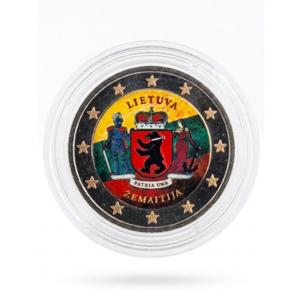 Monetoje pavaizduota ant užpakalinių kojų stovinti meška su grandine ant kaklo. Ji vaizduojama Žemaitijos herbuose nuo 16-ojo amžiaus. Meška pavaizduota skyde, virš kurio yra karūna ir kurį laiko šarvuotas karys (drąsos, pasiaukojimo ir meilės tėvynei simbolis) ir deivė su inkaru (vilties simbolis). Apačioje iškaltas įrašas lotynų kalba „PATRIA UNA“ (tėvynė viena). Centrinę kompoziciją juosia įrašai „LIETUVA“ ir „ŽEMAITIJA“, monetos išleidimo metai „2019“ ir Lietuvos kalyklos ženklas. Išorinėje dalyje (žiede) pavaizduota dvylika Europos Sąjungos vėliavos žvaigždžių.